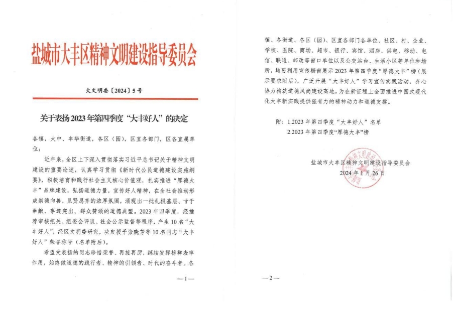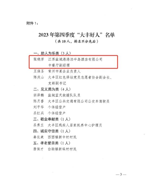 近日,鹽城市大豐區(qū)大力培育和踐行社會核心價值觀,積極開展2023年第四季度“大豐好人”推薦評選表彰活動,著力唱響“厚德大豐”品牌。經(jīng)推薦審核把關、組委會評議、社會公示監(jiān)督等程序,江蘇鹽城港港泊半島酒店有限公司張曉芳同志被授予“大豐好人”榮譽稱號。