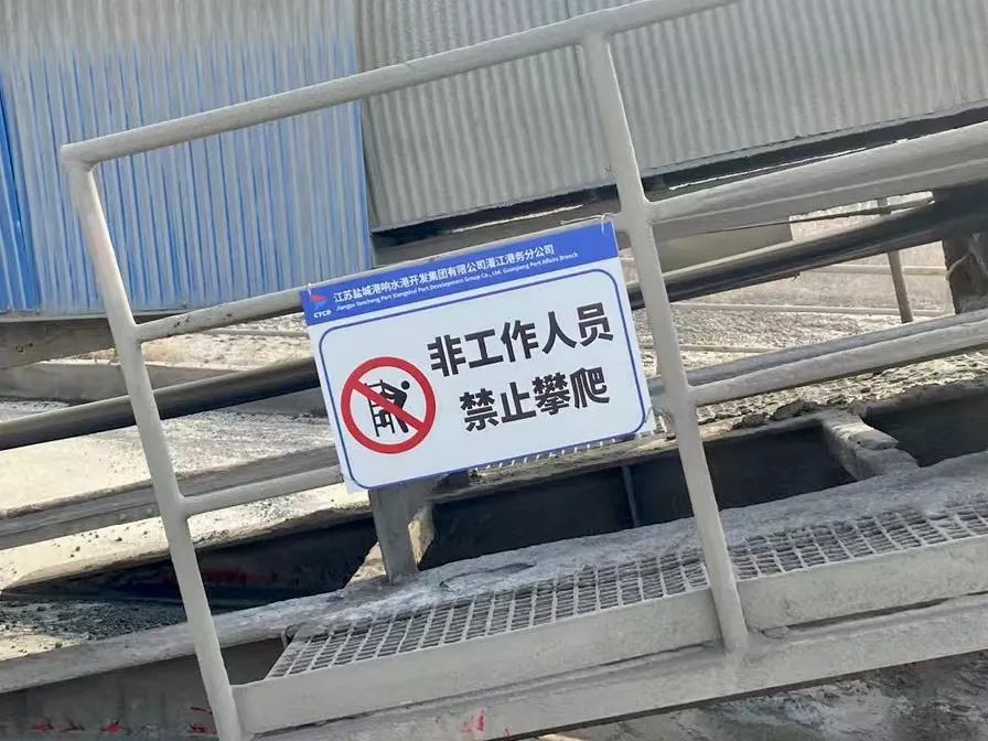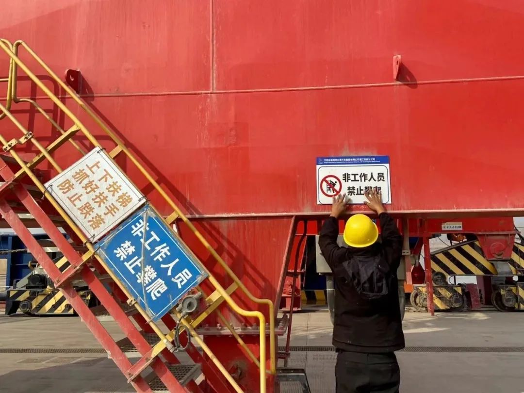 在港區(qū)門閘處設(shè)置“非作業(yè)車輛、工作人員禁止入內(nèi)”標(biāo)識(shí),提示社會(huì)人員、車輛不要誤闖誤入港區(qū)。在引橋欄桿上懸掛“注意路口,當(dāng)心貨車”“禁止酒后上崗,必須戴安全帽”等標(biāo)識(shí),提醒工作人員注意自身安全,嚴(yán)肅上崗紀(jì)律;在碼頭后沿護(hù)欄上懸掛“禁止翻越”“水深危險(xiǎn),禁止靠近”,警示工作人員不要翻越碼頭護(hù)欄,遠(yuǎn)離危險(xiǎn)水域。本次完善新增警示標(biāo)識(shí)牌共十余塊。