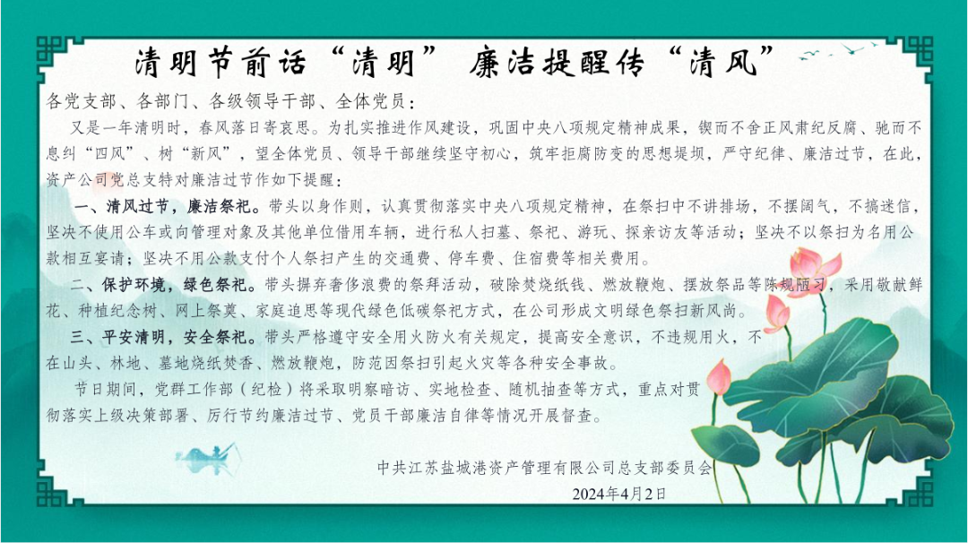 為進(jìn)一步深化全面從嚴(yán)治黨和黨風(fēng)廉政建設(shè)工作,深入推進(jìn)廉政教育,教育引導(dǎo)全體干部職工嚴(yán)守紀(jì)律紅線、筑牢廉潔底線,資產(chǎn)公司黨總支堅(jiān)持“教育在先、警示在先、預(yù)防在先”原則,多措并舉、系統(tǒng)施策,打出“教育促廉、承諾悟廉、安全踐廉”等組合拳,堅(jiān)定不移糾治“四風(fēng)”,推動(dòng)節(jié)日風(fēng)氣持續(xù)向好。