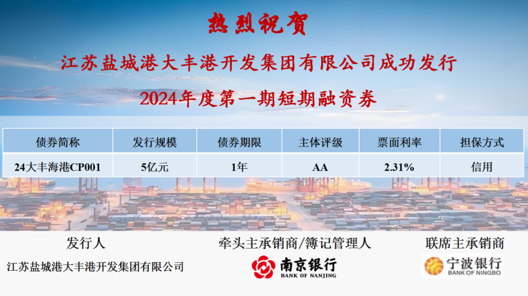 6月11日,大豐港開發(fā)集團(tuán)2024年度第一期短期融資券成功發(fā)行,簿記金額5億元,發(fā)行利率2.31%,認(rèn)購2.78倍,創(chuàng)大豐港開發(fā)集團(tuán)成立以來發(fā)行利率新低。