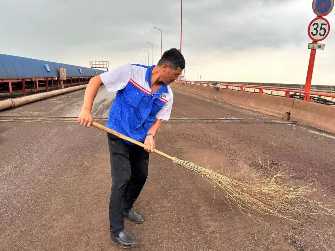 在糧食碼頭引橋,散落的貨物殘?jiān)S處可見,清掃隊(duì)員們迅速行動(dòng),認(rèn)真細(xì)致地進(jìn)行清理,確保做到不漏項(xiàng)、不脫節(jié)、無死角、無盲區(qū)。