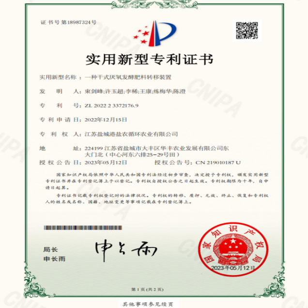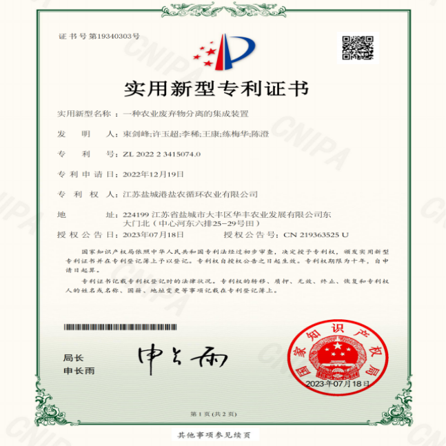 扎實推進科研創(chuàng)新,不斷將理論研究成果轉(zhuǎn)化到實際生產(chǎn)過程與產(chǎn)品中,截至目前,鹽農(nóng)循環(huán)農(nóng)業(yè)先后取得了3個肥料登記證,獲得自主研發(fā)專利24項(其中發(fā)明專利4項),另外還有15項專利已受理。率先使用新型機械沼液還田機,實現(xiàn)沼液在旱作物大面積推廣施用,替代70%以上化肥用量,將理論轉(zhuǎn)化為實際?!罢右涸诘钧溳喿魃鲜┯眉夹g(shù)規(guī)范”地方標準成功立項,為沼液推廣應(yīng)用打下堅定的基礎(chǔ)。 申報成功國家高新技術(shù)企業(yè)、江蘇省農(nóng)業(yè)科技型企業(yè)、江蘇省三星上云企業(yè)、市級農(nóng)業(yè)產(chǎn)業(yè)化龍頭企業(yè)等稱號。與揚州大學(xué)等高校共同申報的2022年江蘇省碳達峰碳中和科技創(chuàng)新專項資金項目-沿海灘涂農(nóng)田生態(tài)碳匯能力提升模式構(gòu)建和試驗示范基地建設(shè)也正在按進度穩(wěn)步推進。