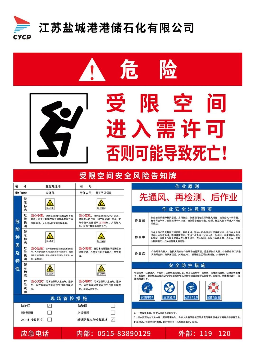 ????作業(yè)現(xiàn)場必須配備呼吸器、通訊器材、安全繩索等防護(hù)設(shè)施和應(yīng)急裝備。作業(yè)現(xiàn)場必須配備監(jiān)護(hù)人員,與作業(yè)人員有效溝通,方便及時(shí)實(shí)施救助。