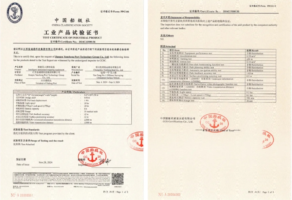 “鹽港一號”近海測繪無人裝備建造完成后,科技集團(tuán)邀請中國船級社、測繪公司等單位在大豐港區(qū)共同開展了實(shí)船驗證,對負(fù)載、航速、定位和路徑反饋精度、圖傳和通訊、路徑規(guī)劃等主要性能指標(biāo)進(jìn)行了驗證,成功獲得了船級社頒發(fā)的工業(yè)產(chǎn)品試驗證書,為后續(xù)港口測繪裝備優(yōu)化改進(jìn)提供了數(shù)據(jù)支持,為產(chǎn)品投入應(yīng)用和產(chǎn)業(yè)化打下了堅實(shí)基礎(chǔ)。