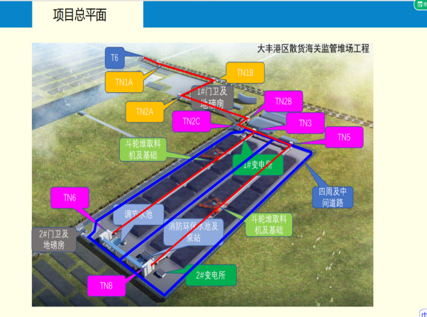 該項(xiàng)目陸域用地面積25.03萬㎡,其南北向縱深約736.83米,東西向?qū)挾葎t約為318.97米。作為大豐港區(qū)重點(diǎn)工程的一部分,該項(xiàng)目從二期散貨堆場已建的T6轉(zhuǎn)運(yùn)站預(yù)留的2路皮帶機(jī)接口延伸而來,旨在通過T6轉(zhuǎn)運(yùn)站皮帶機(jī)的延伸及大豐港現(xiàn)有臨時堆場用地范圍內(nèi)相應(yīng)配套設(shè)施的建設(shè),進(jìn)一步提升港口的功能性和效率。