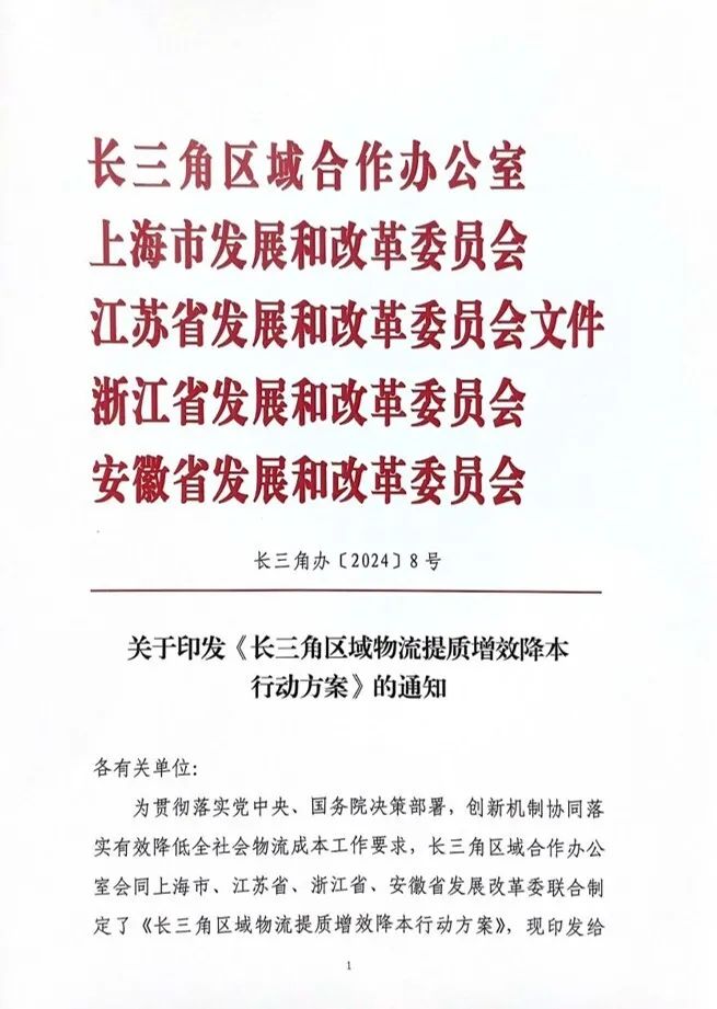 為貫徹落實(shí)黨中央、國務(wù)院決策部署,創(chuàng)新機(jī)制協(xié)同落實(shí)國家層面有效降低全社會(huì)物流成本工作要求,推動(dòng)降低長三角區(qū)域物流成本、提高經(jīng)濟(jì)運(yùn)行效率,長三角區(qū)域合作辦公室、上海市發(fā)展改革委、江蘇省發(fā)展改革委、浙江省發(fā)展改革委、安徽省發(fā)展改革委聯(lián)合印發(fā)《長三角區(qū)域物流提質(zhì)增效降本行動(dòng)方案》,明確了7方面37項(xiàng)具體舉措。