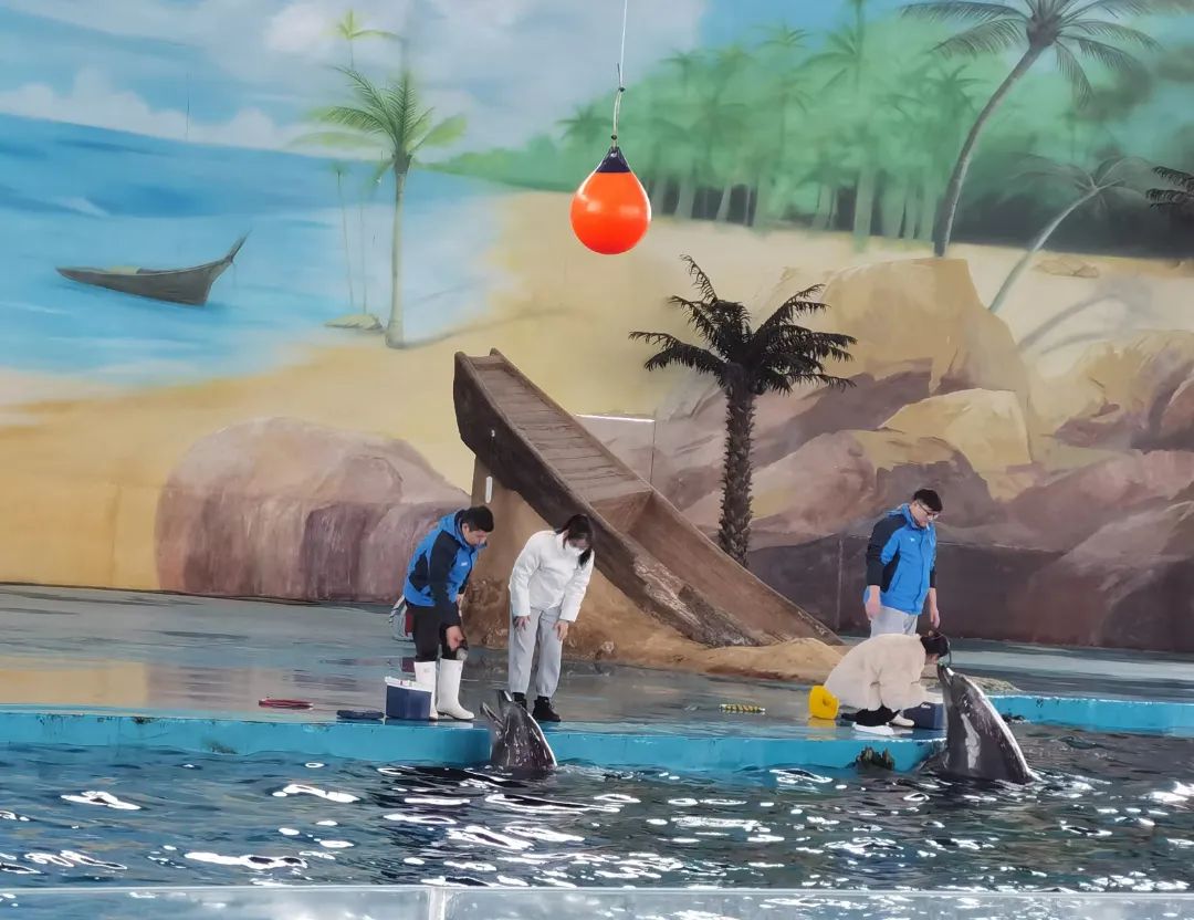 在海洋劇場,海豚明星們與馴養(yǎng)師默契配合,在水中奉獻出一場場精彩的演出,海豚們靈活的身姿、可愛的外表、天籟般的歌聲以及馴養(yǎng)師們卓越的水秀技巧,贏得了現(xiàn)場觀眾的陣陣歡呼。