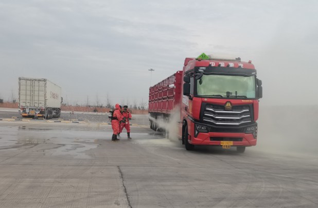 演練模擬危險品運(yùn)輸車輛液體泄漏引發(fā)火災(zāi)場景。停車場消控中心接警后,現(xiàn)場負(fù)責(zé)人立即啟動應(yīng)急預(yù)案,組織現(xiàn)場勘查并上報應(yīng)急指揮中心。指揮中心迅速響應(yīng),組織園區(qū)救援隊伍開展初期火災(zāi)撲救和人員疏散,同時引導(dǎo)消防救援隊伍支援。演練中,各參演單位分工明確,配合有序。救援人員身著防化服實施現(xiàn)場警戒和人員疏散,啟用泡沫滅火系統(tǒng)控制火勢,最終成功撲滅火災(zāi)。隨后,使用空氣檢測設(shè)備對現(xiàn)場進(jìn)行全面檢測,確保環(huán)境安全。整個演練流程規(guī)范、處置高效,有效檢驗了應(yīng)急處置能力。