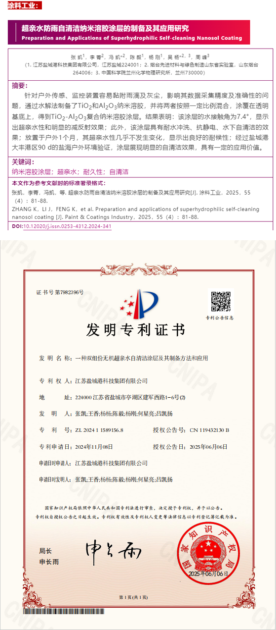 課題研究內(nèi)容為針對雨天作業(yè)過程中對司機及感知傳感器的影響,從超親水防雨涂層材料方面出發(fā),開發(fā)一種高性能、長期效港口感知傳感器鏡頭表面的超親水防雨涂層材料,為港口運行提供安全保障。依托該課題,科技集團取得《一種雙組份無機超親水自清潔涂層及其制備方法和應(yīng)用》發(fā)明專利1項,在核心期刊《涂料工業(yè)》發(fā)表《超親水防雨自清潔納米溶膠涂層的制備及其應(yīng)用研究》論文1篇。