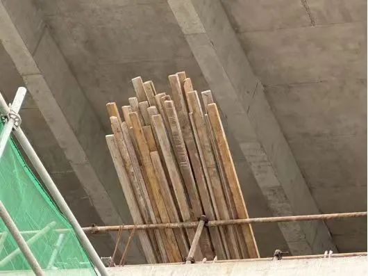 混凝土結構施工區(qū)域,淺棕色木方違規(guī)傾斜堆放于臨邊圍擋處,遇外力(如碰撞、大風)易發(fā)生墜落,威脅下方作業(yè)人員安全。