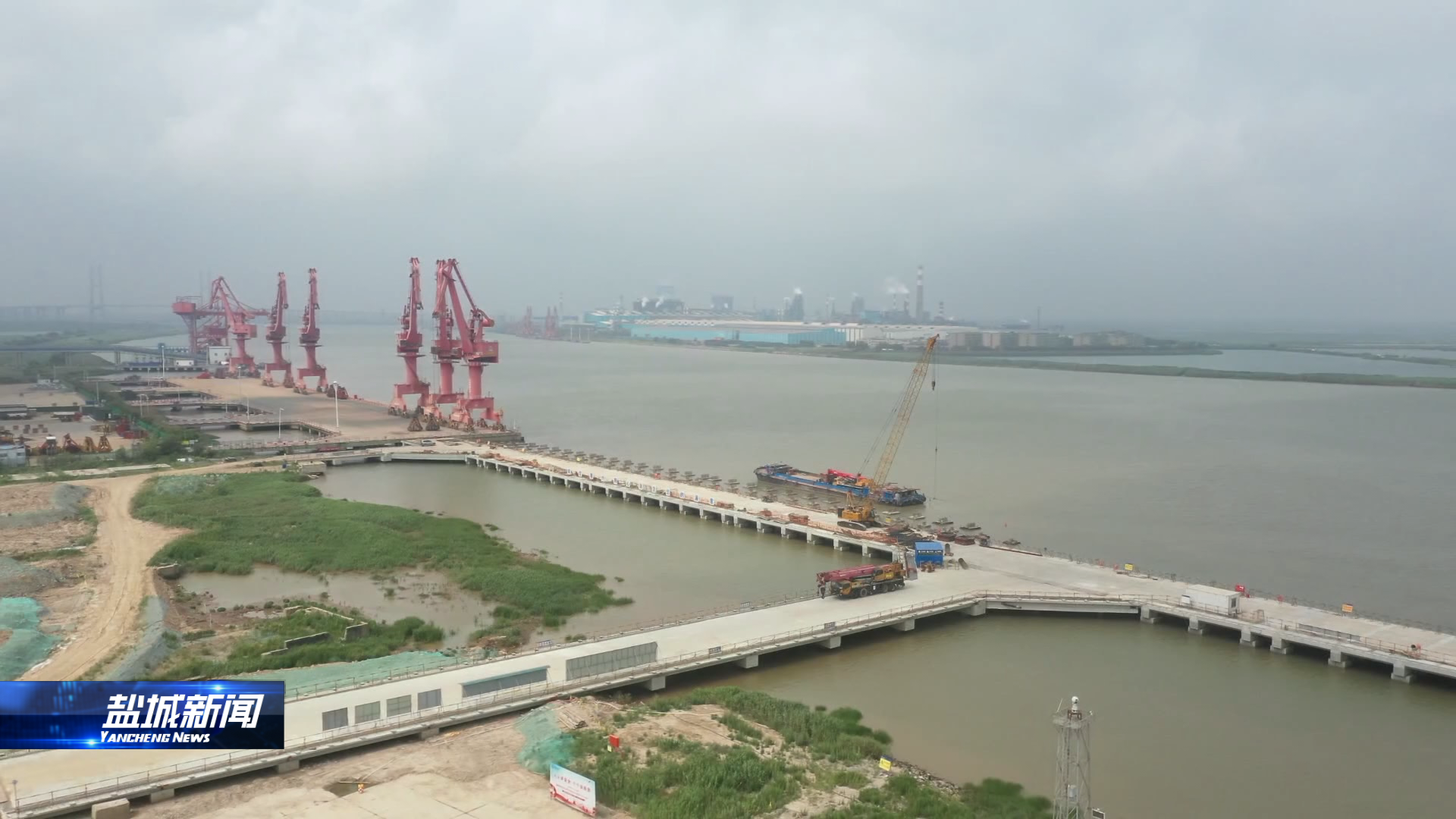 鏡頭轉(zhuǎn)向鹽城港濱海港區(qū)主港池北區(qū)通用碼頭三期工程施工現(xiàn)場,航運碼頭已初具規(guī)模。堆場區(qū)域工人正安裝路緣石,灑水車穿梭養(yǎng)護(hù)。據(jù)項目負(fù)責(zé)人介紹,目前項目每天投入30余人及10余臺設(shè)備,搶抓進(jìn)度,確保7月按計劃進(jìn)行道路面層施工和港池開挖。