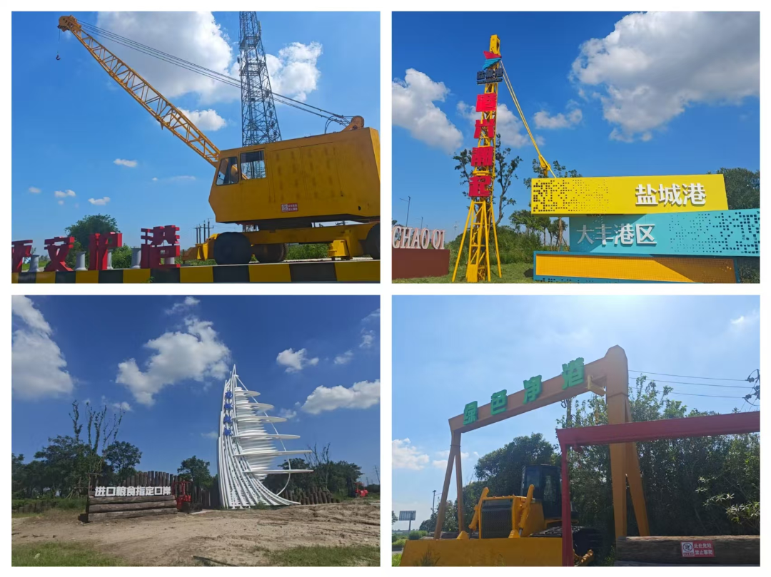 轉(zhuǎn)角處,一臺(tái)閑置輪胎式起重機(jī)穩(wěn)穩(wěn)“站”在特制的碼頭造型基座上。它那剛勁的鋼鐵骨架,高高托舉著象征物流單元的集裝箱雕塑,瞬間將人拉回吊臂揮舞、貨柜起落的繁忙碼頭現(xiàn)場(chǎng)。這個(gè)場(chǎng)景暗藏雙重密碼:穩(wěn)固的姿態(tài)是“平安發(fā)展”的無(wú)聲誓言,而“吞吐量齊頭并進(jìn)”的蓬勃造型,則大聲宣告著“港興潮起通天下”的開放雄心!