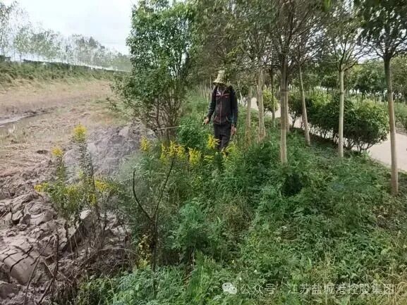 加拿大“一枝黃花”作為外來入侵物種,其根系發(fā)達(dá)且繁殖力極強(qiáng)。一旦在河道及周邊區(qū)域蔓延,不僅會與本土植物爭奪養(yǎng)分,破壞水域生態(tài)平衡,還可能堵塞河道,影響行洪排澇,對水環(huán)境構(gòu)成嚴(yán)重威脅。在“一枝黃花”尚未開花之際,鹽農(nóng)沿海農(nóng)業(yè)迅速啟動了區(qū)域內(nèi)專項清理行動,重點(diǎn)對轄區(qū)內(nèi)河道兩岸、道路兩側(cè)及林地田間的“一枝黃花”進(jìn)行全面排查和集中清除。