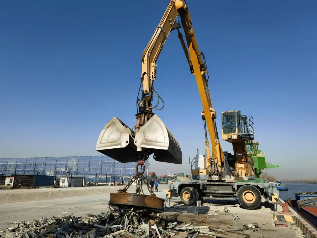 為切實解決作業(yè)效率低下的問題,亭湖港區(qū)調度組與創(chuàng)新團隊多次研究,最終確定使用抓料機作業(yè),同時為防止抓料機抓取廢鋼對抓斗造成損傷,團隊還特別制定抓料機改造方案,通過兩根定制鋼絲繩將電磁吸盤安裝到抓料機抓斗下方,并通過電纜線路改造,抓料機駕駛員可以在駕駛抓料機的同時操控吸盤。由于抓料機的靈活機動,可以自由伸縮抓臂,作業(yè)現(xiàn)場不再需要裝載機司機的參與。自改造實施后,港區(qū)廢鋼生產作業(yè)耗時耗力的難題得到了有效解決,極大地提高了港區(qū)生產運營效率,該項改進創(chuàng)新在保證安全的基礎上,共節(jié)省人工2名,作業(yè)時長由4天節(jié)省為2天,作業(yè)效率提高50%。