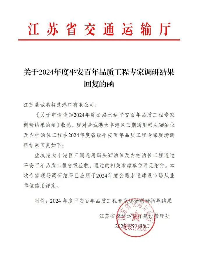 近日,省交通運(yùn)輸廳公布2024年度“平安百年品質(zhì)工程”專家現(xiàn)場(chǎng)調(diào)研指導(dǎo)結(jié)果,鹽城港大豐港區(qū)三期通用碼頭3#泊位及內(nèi)檔泊位工程成功通過,標(biāo)志著鹽城港在省級(jí)“品質(zhì)工程”創(chuàng)建領(lǐng)域取得了歷史性突破。