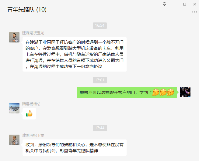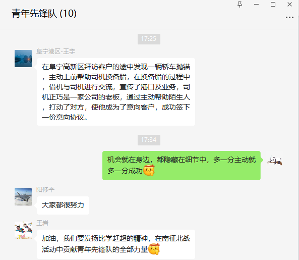 使命催人奮進(jìn),實干促人成長。青年先鋒隊特別注重隊員業(yè)務(wù)能力的持續(xù)提升。每周請一位隊員在青年先鋒隊群內(nèi)分享拜訪心得,通過交流互動,不僅掌握了更高效的拜訪技巧,還加深了對港口需求趨勢的理解。