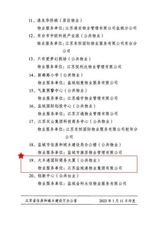 近日,江蘇省住房和城鄉(xiāng)建設(shè)廳公布2021年度省級(jí)示范物業(yè)管理項(xiàng)目名單,“鹽城港大豐港國(guó)際商務(wù)大廈(公共物業(yè))”被評(píng)價(jià)為“2021年度省級(jí)示范物業(yè)管理項(xiàng)目”,該項(xiàng)目由鹽城港物業(yè)集團(tuán)有限公司提供管理服務(wù),該榮譽(yù)是江蘇省物業(yè)管理行業(yè)省級(jí)最高榮譽(yù)。