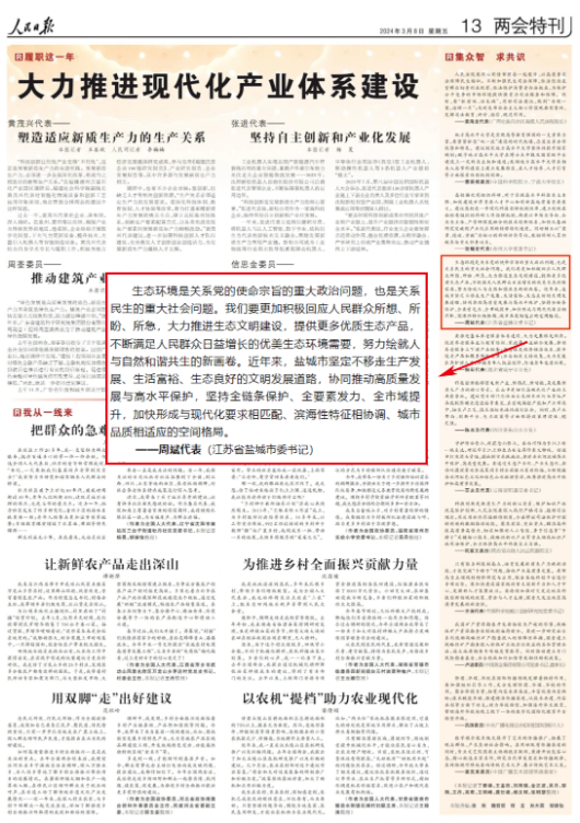 “鹽城是長三角中心區(qū)城市中唯一一個農(nóng)業(yè)總產(chǎn)值超千億元的城市,穩(wěn)住農(nóng)業(yè)基本盤是我們的重大政治責(zé)任?!比珖舜蟠?、江蘇省鹽城市委書記周斌表示,鹽城將踐行大農(nóng)業(yè)觀、大食物觀,努力建設(shè)“東部沿海大糧倉”“生態(tài)食品大超市”“鄉(xiāng)村休閑大花園”,擦亮現(xiàn)代農(nóng)業(yè)名片。