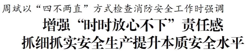 6月27日下午,市委書(shū)記周斌以“四不兩直”方式檢查消防安全工作。他強(qiáng)調(diào),要深入學(xué)習(xí)貫徹習(xí)近平總書(shū)記關(guān)于安全生產(chǎn)和消防工作的重要論述,按照省市委部署要求,時(shí)刻繃緊安全生產(chǎn)這根弦,增強(qiáng)“時(shí)時(shí)放心不下”的責(zé)任感和“事事心中有底”的行動(dòng)力,抓實(shí)抓細(xì)隱患排查整治,壓緊壓實(shí)各方責(zé)任,全面筑牢安全防線,切實(shí)維護(hù)人民群眾生命財(cái)產(chǎn)安全。