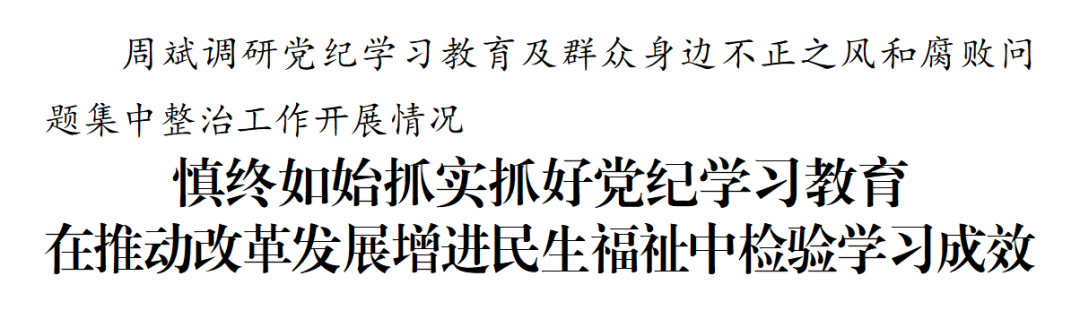 周斌在調(diào)研中指出,黨紀(jì)學(xué)習(xí)教育要強化原文研學(xué),深學(xué)細(xì)悟習(xí)近平總書記關(guān)于全面加強黨的紀(jì)律建設(shè)的重要論述,堅持融入日常、抓在經(jīng)常,持續(xù)在深化內(nèi)化轉(zhuǎn)化上下功夫,引導(dǎo)黨員干部更好把遵規(guī)守紀(jì)刻印在心。要強化警示教育,用好紅色資源、鮮活案例和生動現(xiàn)場,加強正面引導(dǎo)和反面警示,讓黨員干部受警醒、明底線、知敬畏,真正做到知行知止。要強化學(xué)用結(jié)合,堅持兩手抓、兩促進(jìn),將黨紀(jì)學(xué)習(xí)教育與整治形式主義為基層減負(fù)、整治群眾身邊不正之風(fēng)和腐敗問題、推進(jìn)經(jīng)濟社會高質(zhì)量發(fā)展相結(jié)合,在嚴(yán)格約束下積極擔(dān)當(dāng)作為,切實把學(xué)習(xí)成效轉(zhuǎn)化為推動改革發(fā)展、增進(jìn)民生福祉的實際舉措,真正讓黨員受教育、發(fā)展見成效、群眾得實惠。