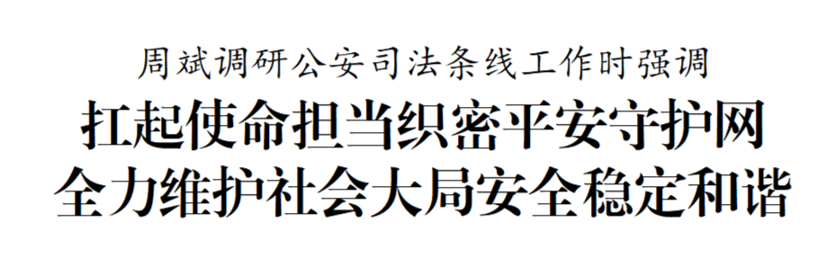 在調(diào)研中,周斌指出,公安司法條線是維護(hù)社會(huì)穩(wěn)定的“主力軍”、服務(wù)高質(zhì)量發(fā)展的“護(hù)航員”。要突出政治引領(lǐng),服務(wù)發(fā)展大局,圍繞優(yōu)化營商環(huán)境、護(hù)航產(chǎn)業(yè)發(fā)展、保障民生福祉等中心任務(wù),找準(zhǔn)工作切入點(diǎn)和發(fā)力點(diǎn),為高質(zhì)量發(fā)展提供堅(jiān)強(qiáng)法治保障。要深化社會(huì)治理,堅(jiān)持和發(fā)展新時(shí)代“楓橋經(jīng)驗(yàn)”,完善網(wǎng)格化管理、精細(xì)化服務(wù)、信息化支撐的基層治理平臺(tái),提升社會(huì)治理現(xiàn)代化水平。要堅(jiān)守人民立場,聚焦群眾“急難愁盼”,扎實(shí)推進(jìn)平安建設(shè)、掃黑除惡、未成年人保護(hù)等工作,不斷增強(qiáng)人民群眾的獲得感、幸福感、安全感。