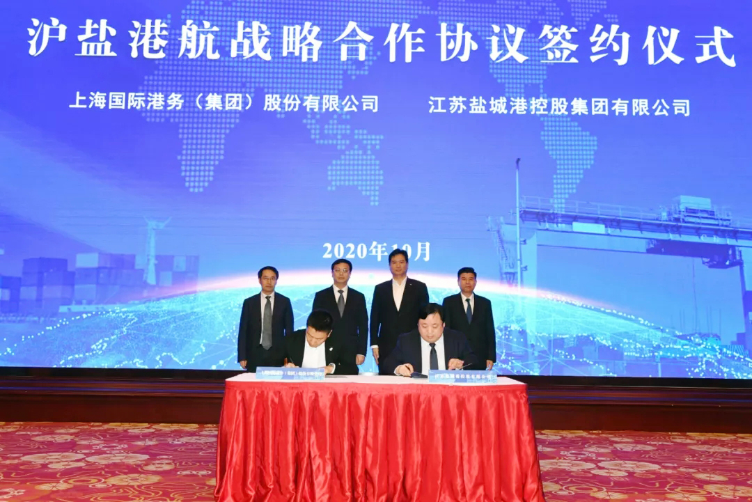 10月30日下午,滬鹽港航合作活動(dòng)暨鹽城港集裝箱海河聯(lián)運(yùn)航線推介會(huì)在鹽城舉行,江蘇鹽城港控股集團(tuán)和上海國(guó)際港務(wù)集團(tuán)簽訂戰(zhàn)略合作協(xié)議。鹽城市市長(zhǎng)曹路寶、上海國(guó)際港務(wù)集團(tuán)總裁嚴(yán)俊出席,共同為合資成立的江蘇鹽城港上港國(guó)際港務(wù)有限公司揭牌。