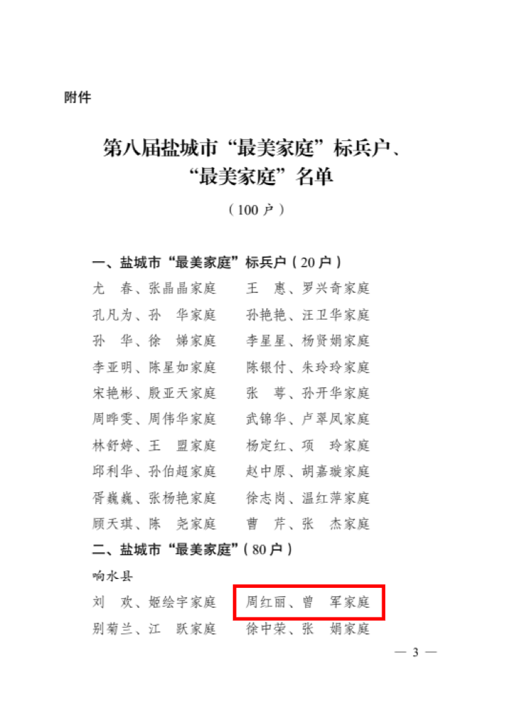 近日,從鹽城市婦女聯(lián)合會(huì)傳來(lái)好消息,在市第八屆鹽城市“最美家庭”評(píng)選活動(dòng)中,鹽城港響水港區(qū)曾軍家庭榮獲鹽城市“最美家庭”稱(chēng)號(hào)。